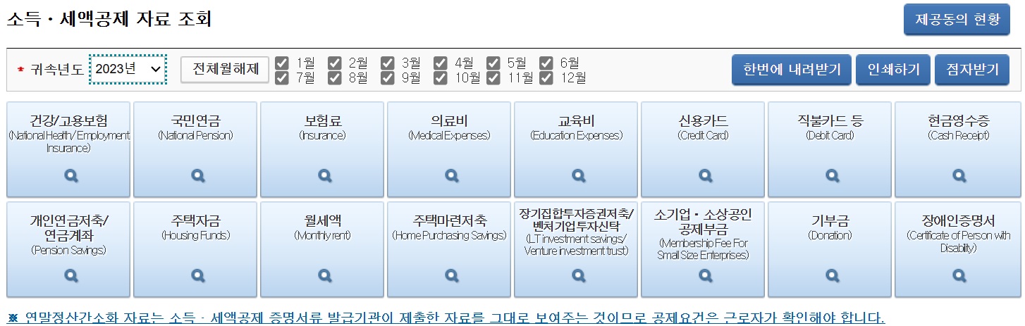 -건강보험, 국민연금, 보험료, 의료비, 교육비, 신용카드, 직불카드, 현금영수증, 개인연금저축/연금계좌, 주택자금, 월세액, 주택마련저축, 기부금, 장애인 증명서 등