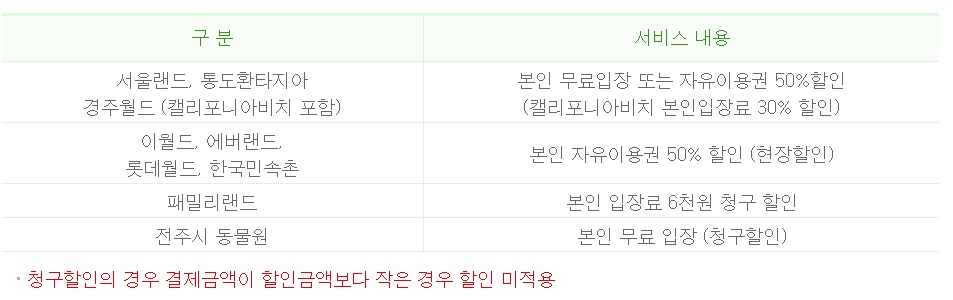 ▶ 놀이공원 : 전국 주요 놀이공원 본인 자유이용권 50% 할인 또는 무료입장(통합 월 1회/연 6회)